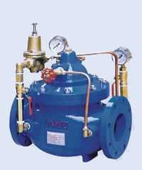 水力控制閥的介紹:水力控制閥就是用水壓控制的閥門,一般分為隔膜型和活塞型兩大類,兩者工作原理相同,它由一個主閥(如圖所示)及其附設的導管、導閥、針閥、球閥和壓力表等組成。根據使用目的、功能及場所的不同可演變成遙控浮球閥、減壓閥、緩閉止回閥、流量控制閥、泄壓閥、水力電動控制閥等。水力控制閥都是以上下游壓力差△P為動力,由導閥控制,使隔膜(活塞)液壓式差動操作、完全由水力自動調節,從而使主閥閥盤完全開啟,或完全關閉及處于調節狀態,當進入隔膜(活塞)上方控制室內的壓力水被排到大氣或下游低壓區時,作用在閥盤底部和隔膜下方的壓力值就大于上方的壓力值,所以將主閥閥盤推到完全開啟的位置:當進入隔膜(活塞)上方控制室的壓力水不能排到大氣或下游低壓區時,作用在隔膜(活塞)上方的壓力值就大于下方的壓力值,所以就會把主閥閥盤壓到完全關閉的位置:當隔膜(活塞)上方控制室內的壓力值處于入口壓力與出口壓力中間時,主閥閥盤就處于調節狀態,其調節位置取決于導管系統中的針閥和可調導閥的聯合控制作用,可調導閥可以通過下游的出口壓力并隨它的變化而開大或關小其自身的小閥口,從而改變隔膜(活塞)上方控制室的壓力值,控制主閥閥盤的調節位置
